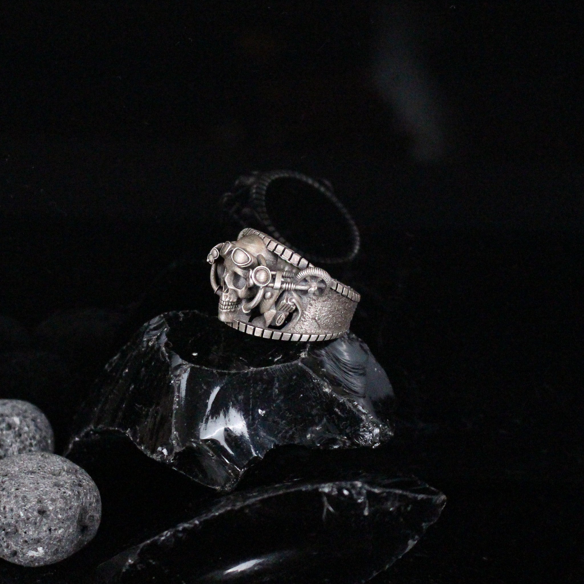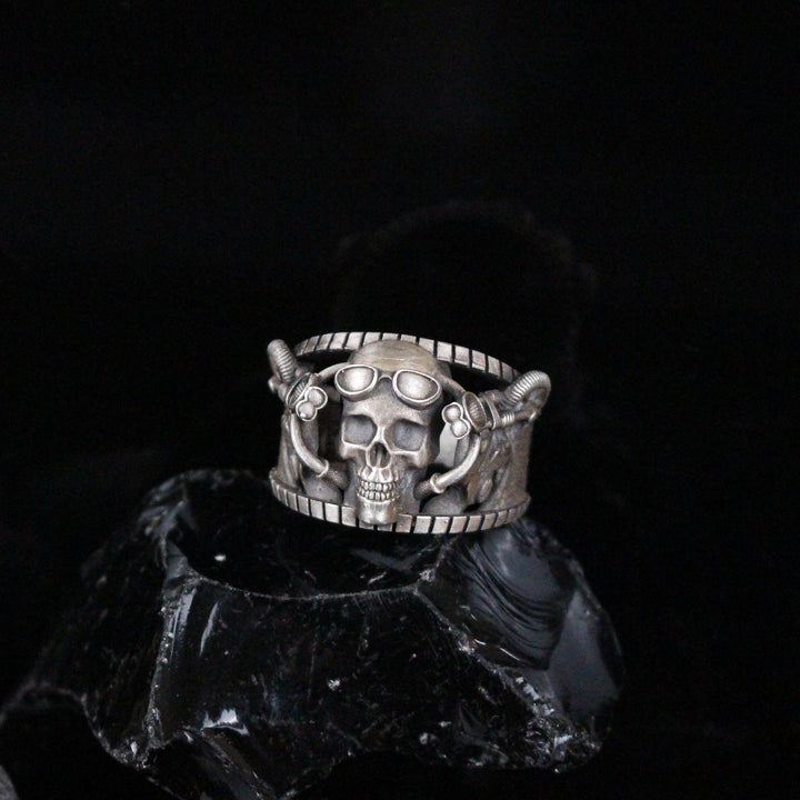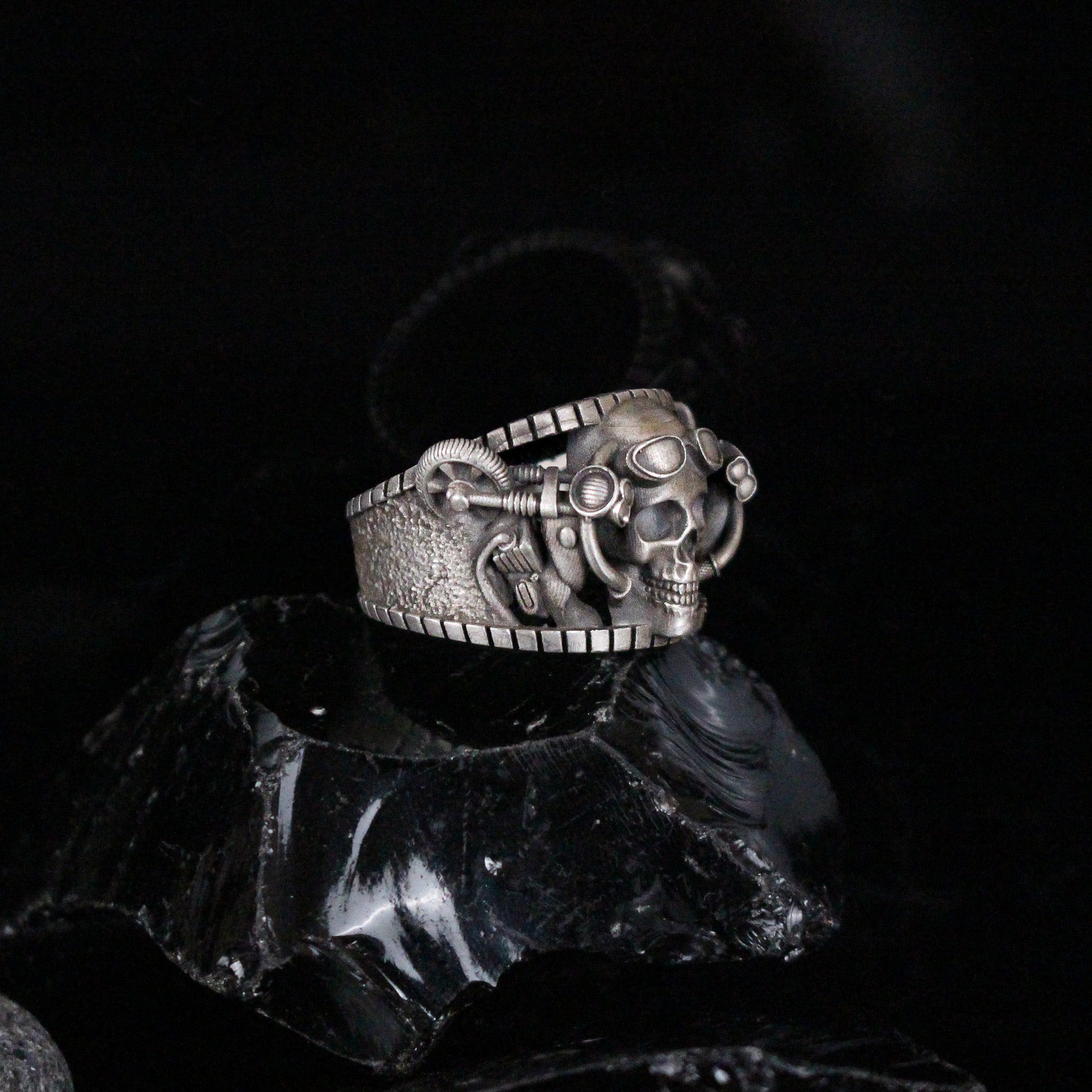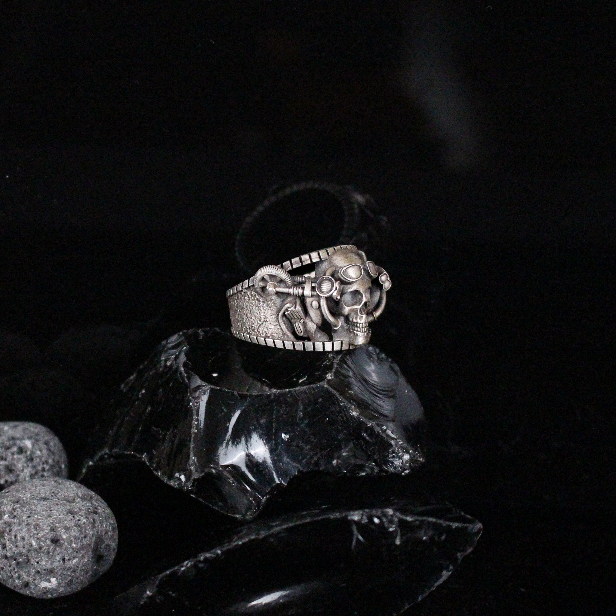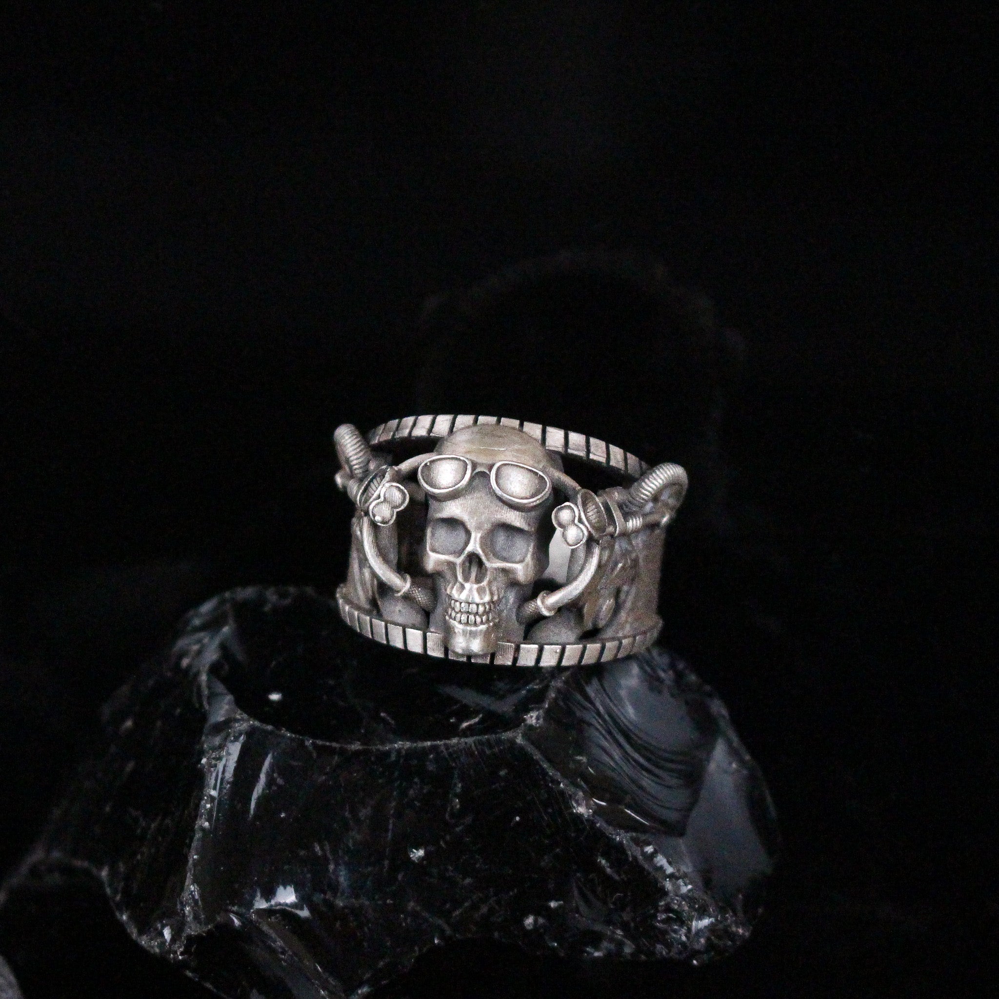 Unleash your rebellious side with this Sterling Silver Biker Skull Ring for Men. Crafted for bold personalities, this 925K sterling silver ring features a highly detailed skull adorned with goggles, along with intricate motorcycle-inspired details. Perfect for bikers and lovers of edgy style, this unique accessory makes a powerful statement.