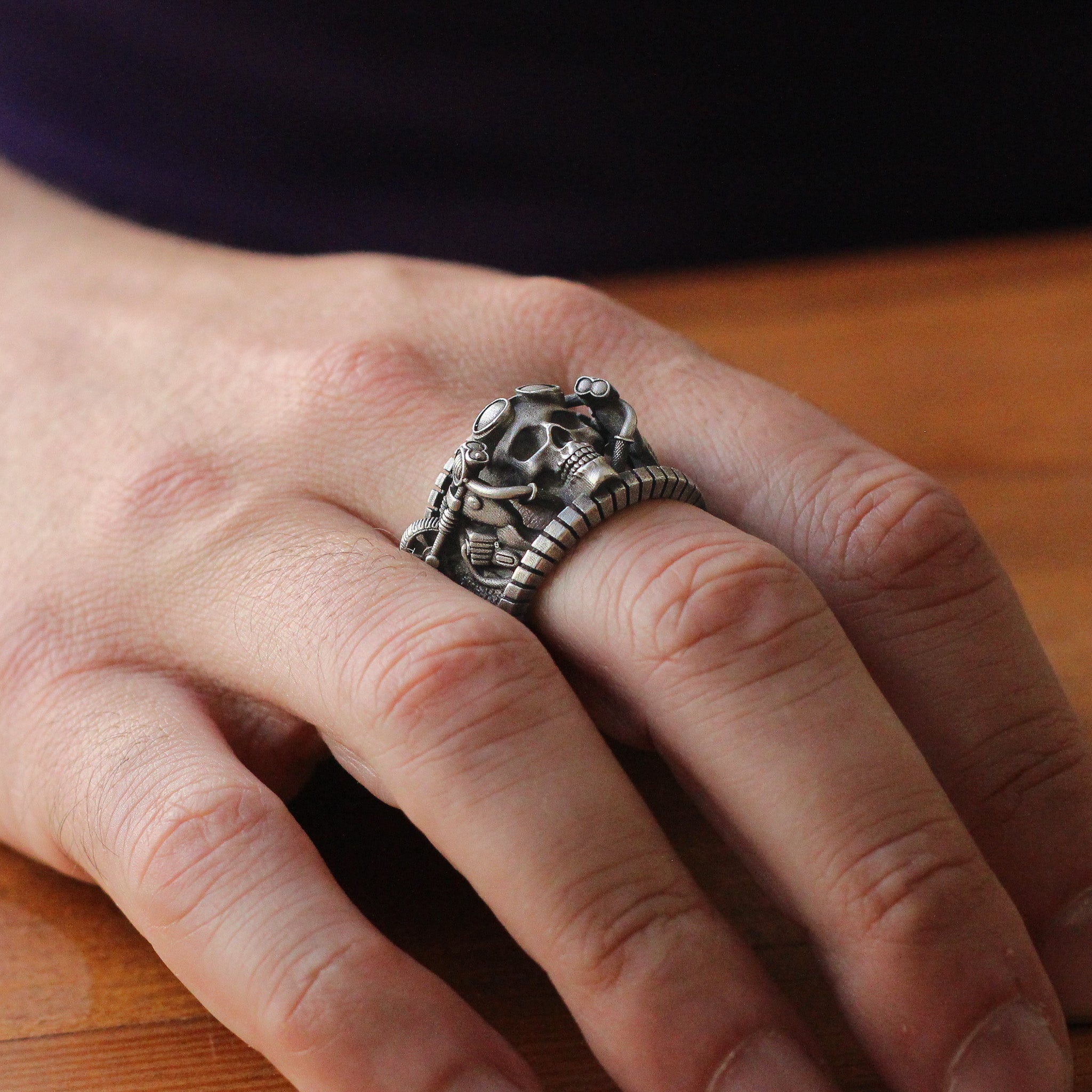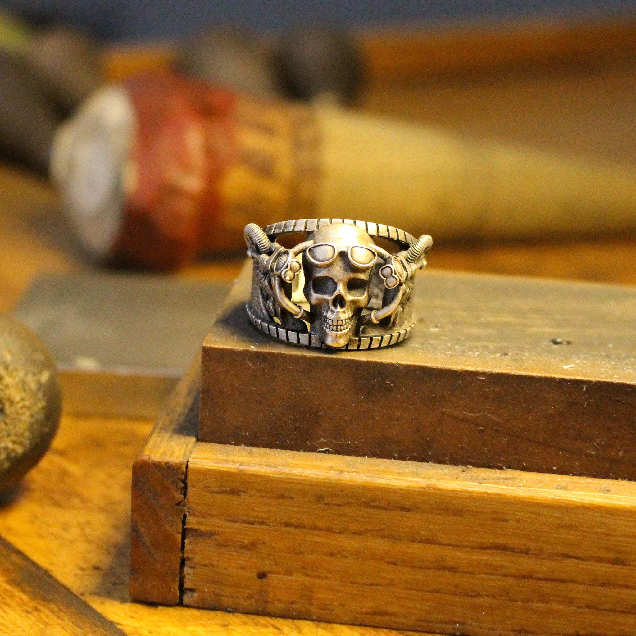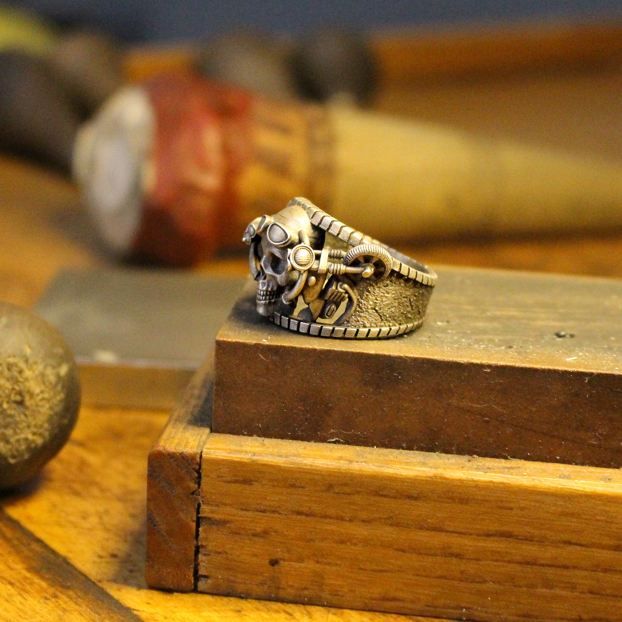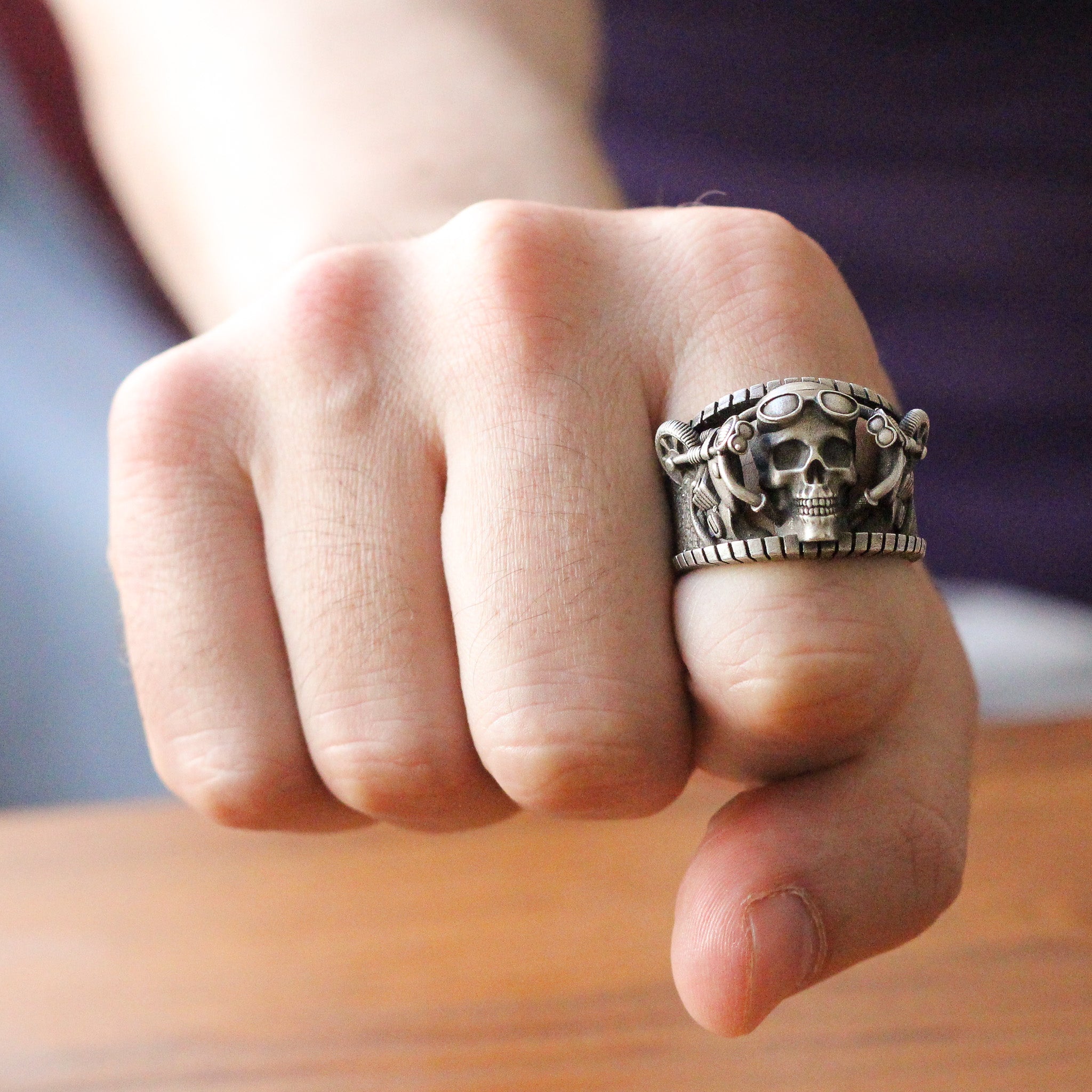 Unleash your rebellious side with this Sterling Silver Biker Skull Ring for Men. Crafted for bold personalities, this 925K sterling silver ring features a highly detailed skull adorned with goggles, along with intricate motorcycle-inspired details. Perfect for bikers and lovers of edgy style, this unique accessory makes a powerful statement.