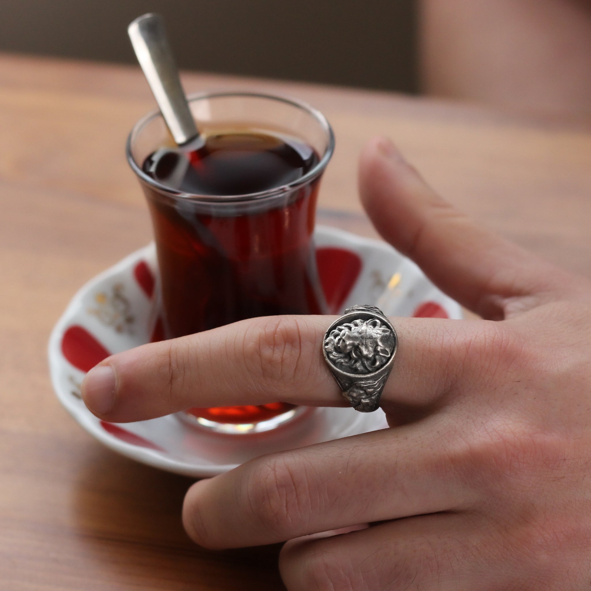 This ring is stylish and pretty ideal for everyday use. The engraving details of the 925k handmade silver ring are very detailed and eye-catching. The ring is coated with oxide to emphasize the details of handmade engraving.