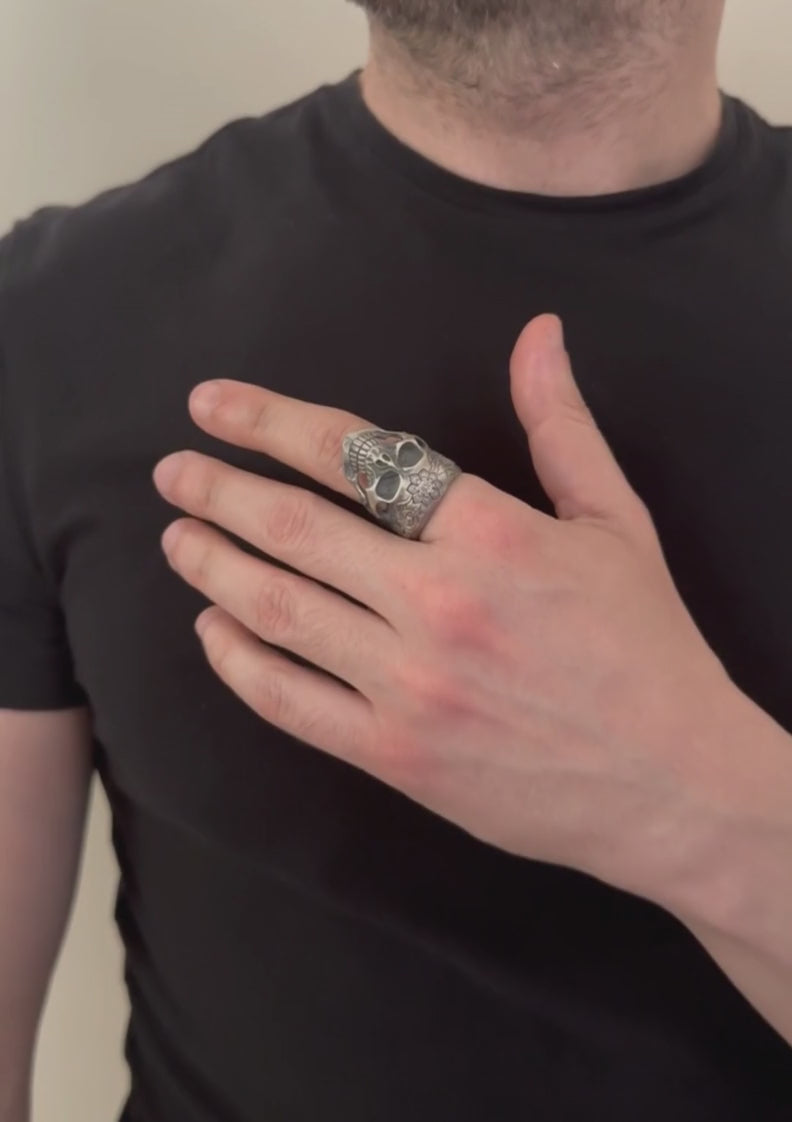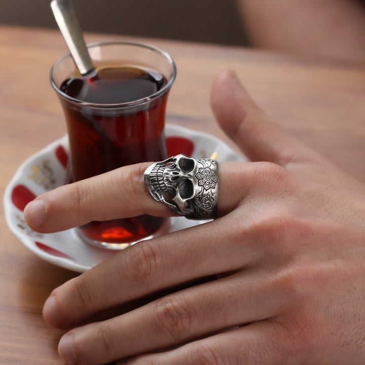 Embrace a perfect blend of boldness and artistry with this Sterling Silver Skull Ring, designed for men who appreciate unique details. The centerpiece features a striking skull, surrounded by intricate floral engravings that add an unexpected touch of elegance and symbolism. Crafted from high-quality 925K sterling silver, this ring is a powerful statement of individuality and style.
