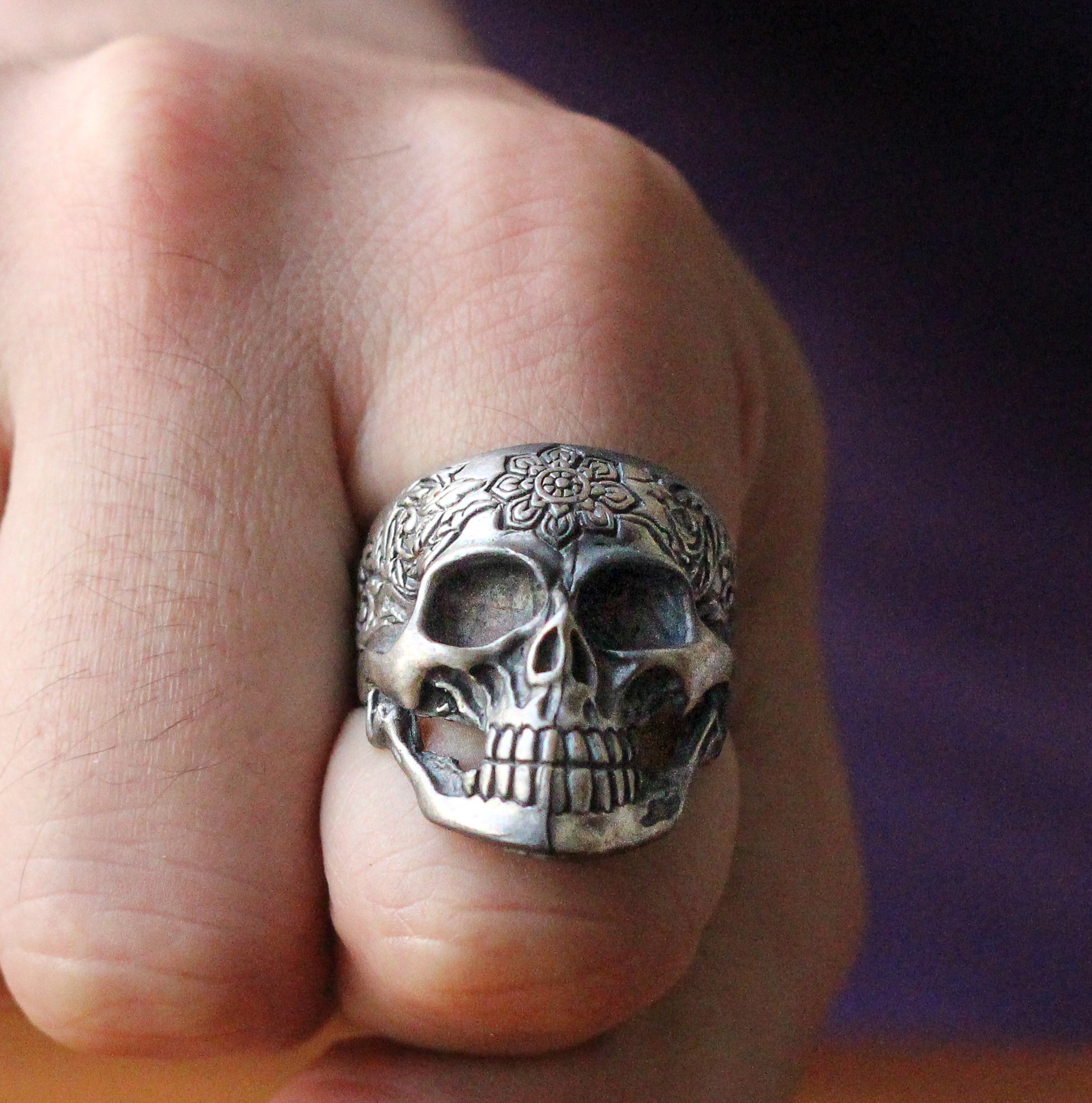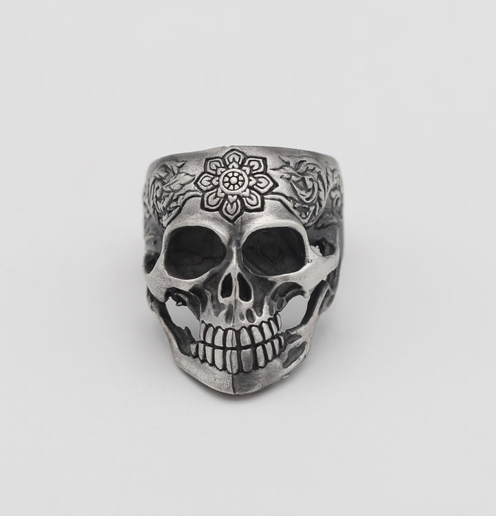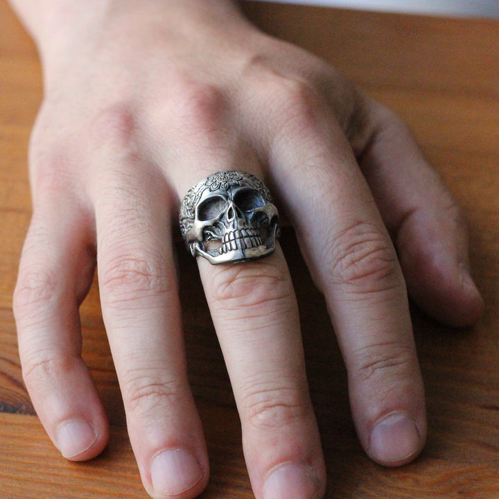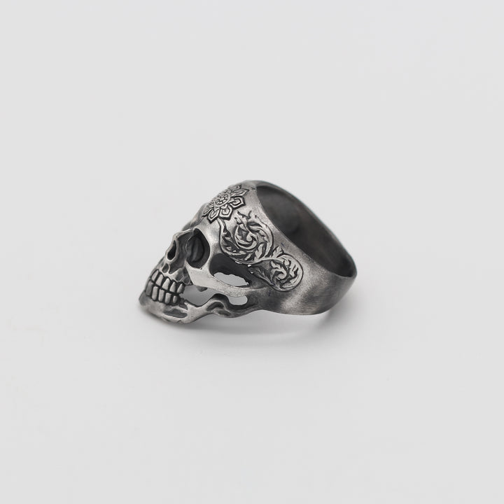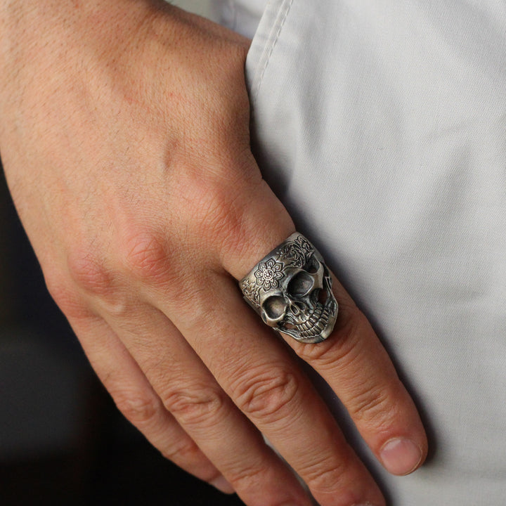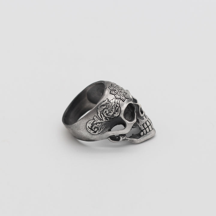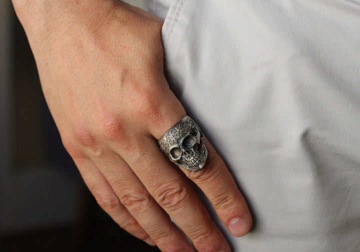 Sterling Silver Skull Ring with Floral Engraving | Bold and Artistic Design for Men