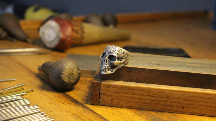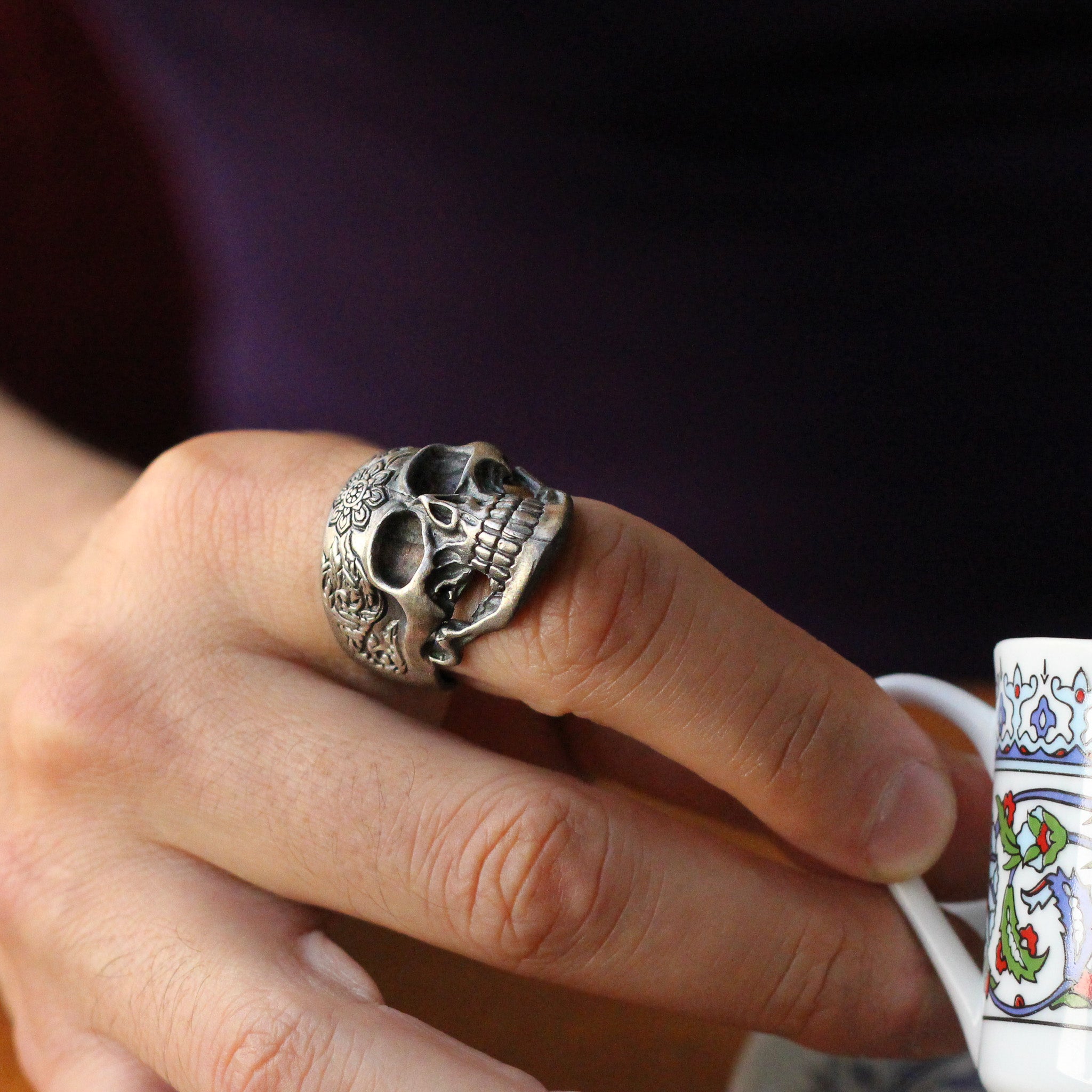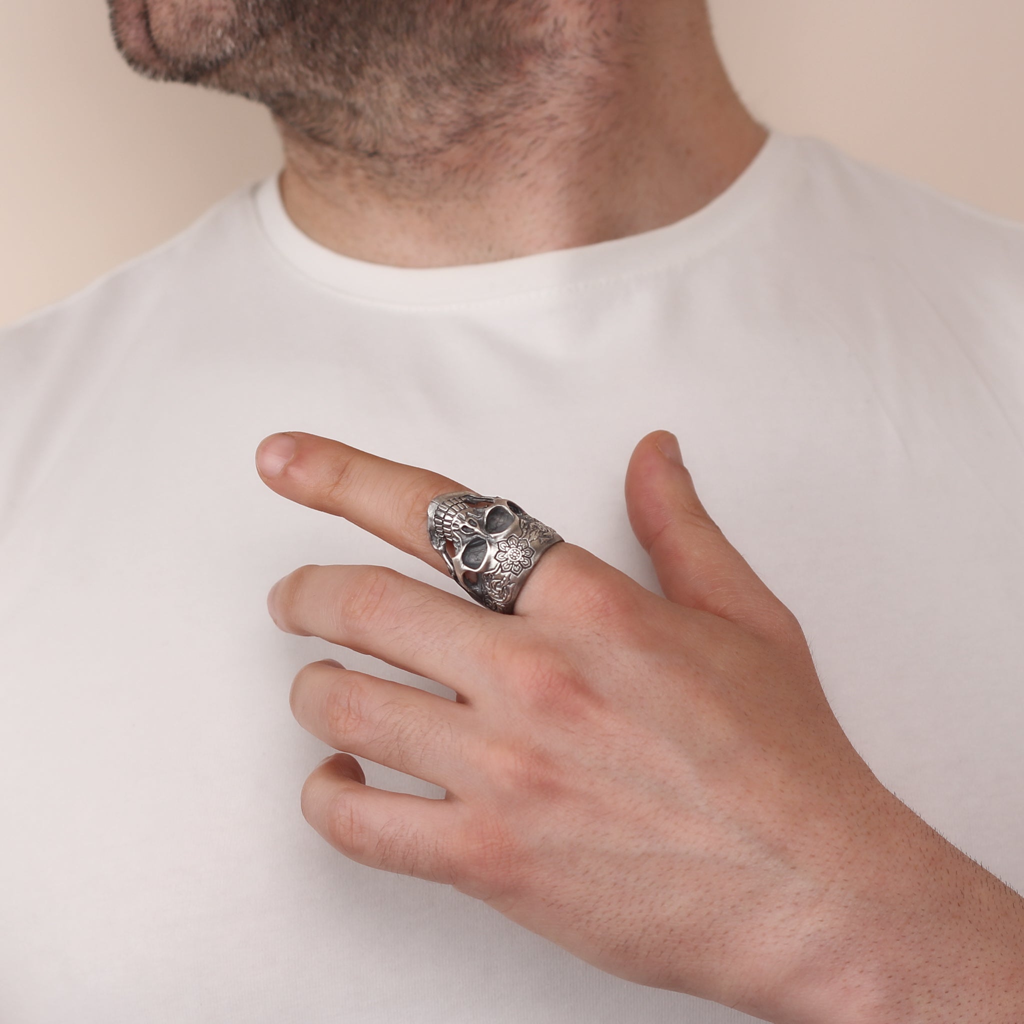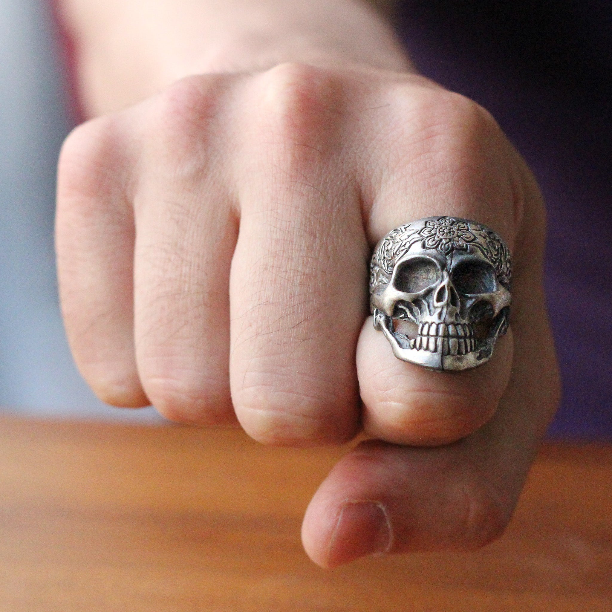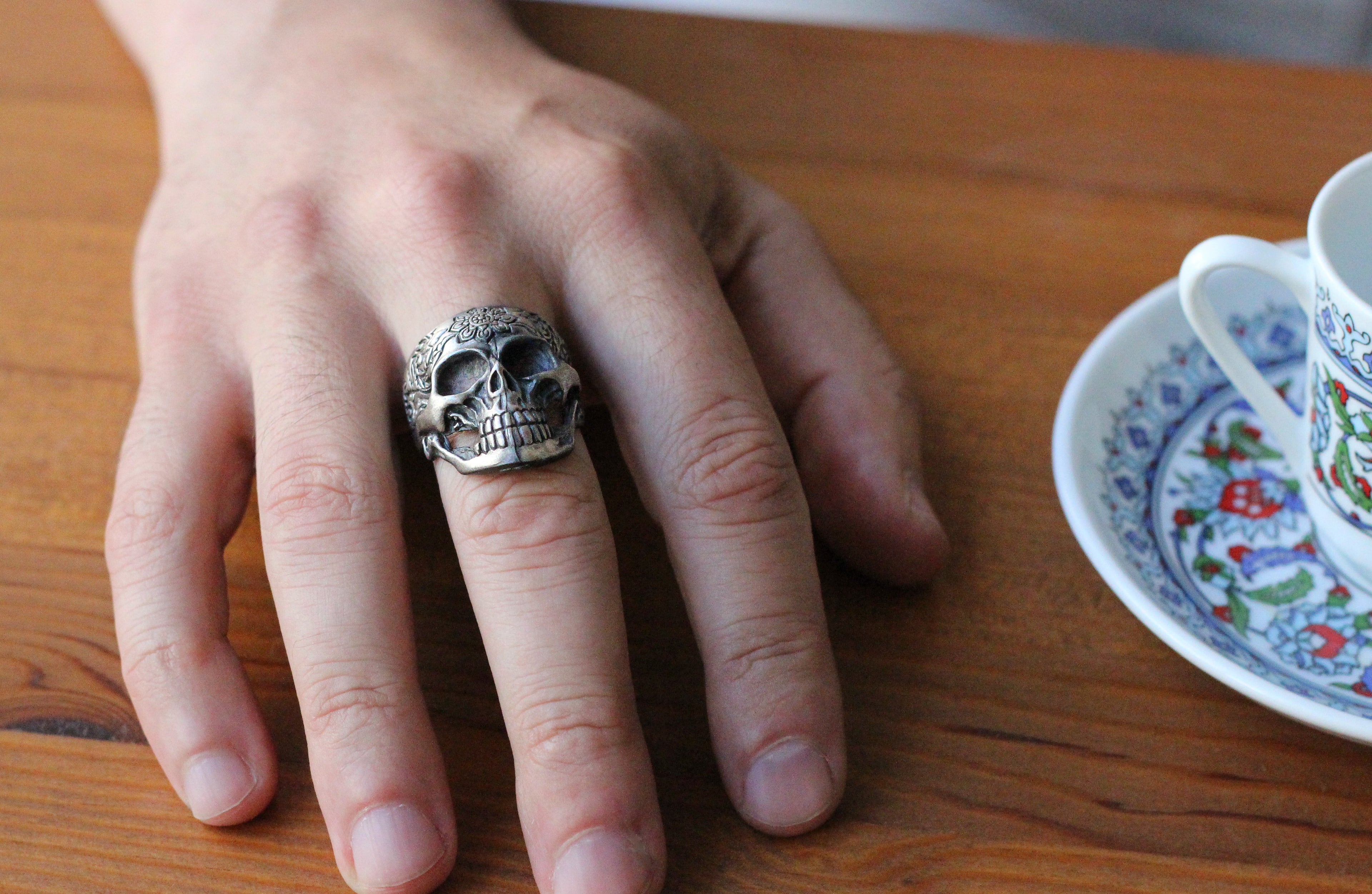 Sterling Silver Skull Ring with Floral Engraving | Bold and Artistic Design for Men
