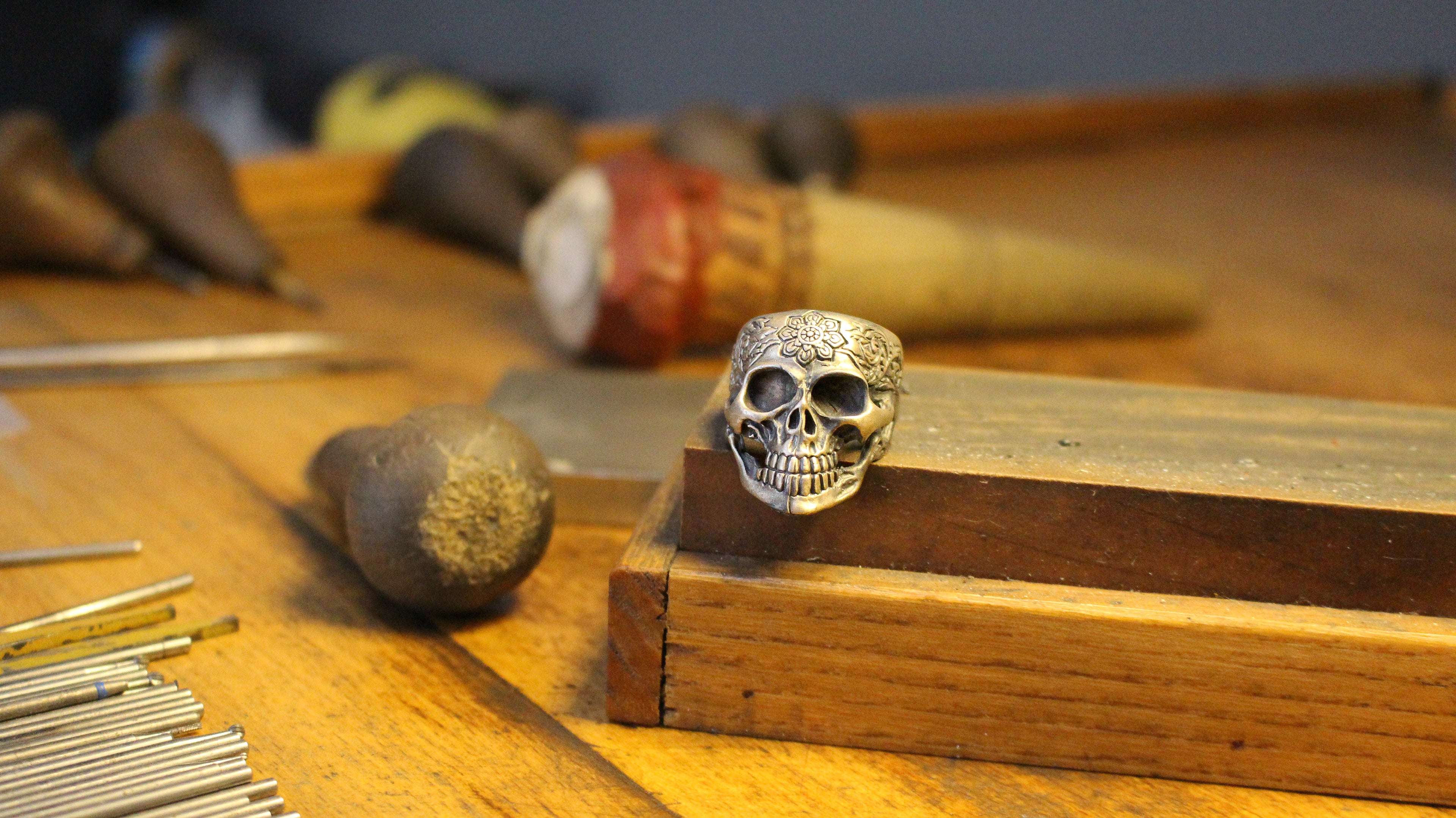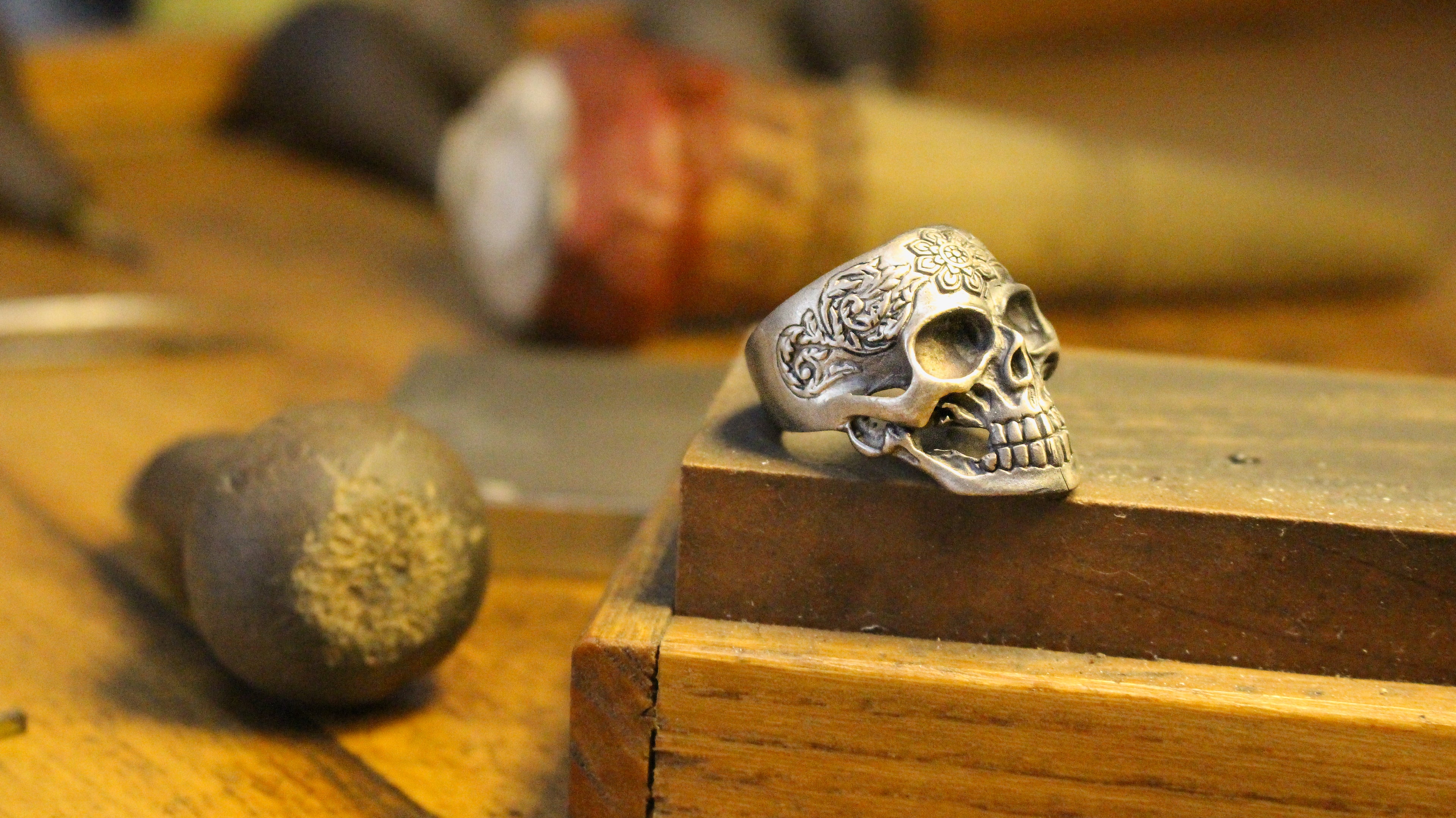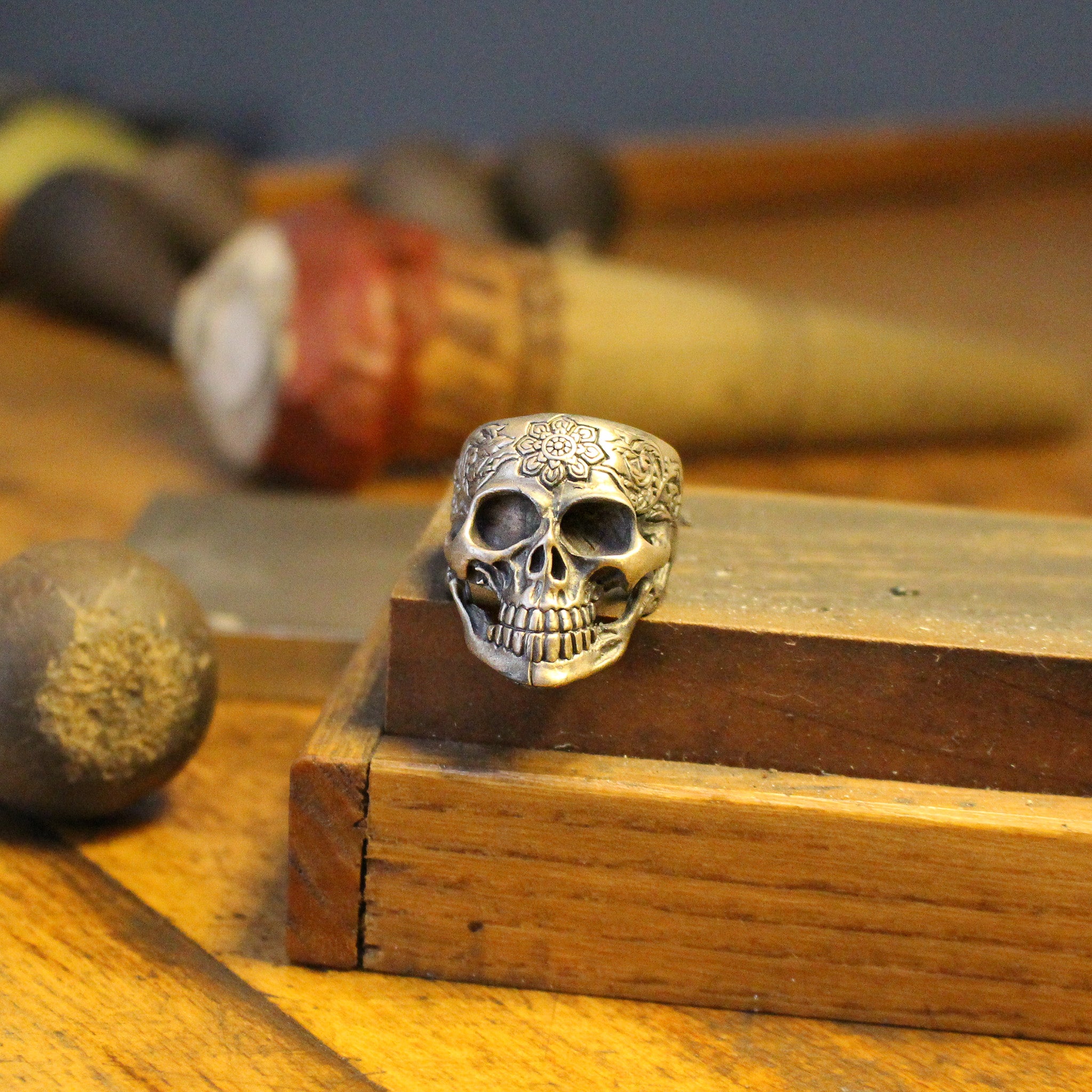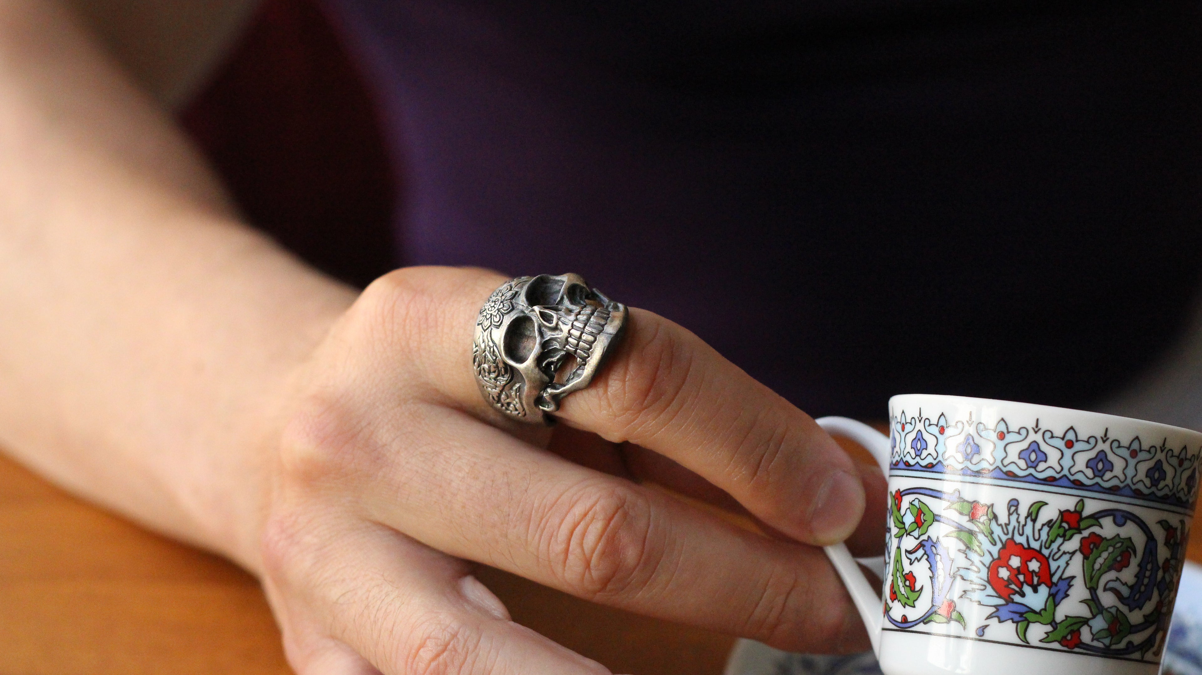 Sterling Silver Skull Ring with Floral Engraving | Bold and Artistic Design for Men