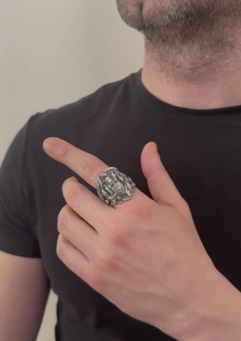 Embrace a bold and edgy aesthetic with this Sterling Silver Snake and Skull Ring for Men. This striking piece features intricately designed snakes wrapping around a detailed skull, symbolizing strength, transformation, and resilience. Crafted from premium 925K sterling silver, this ring is perfect for men who value unique and symbolic accessories.