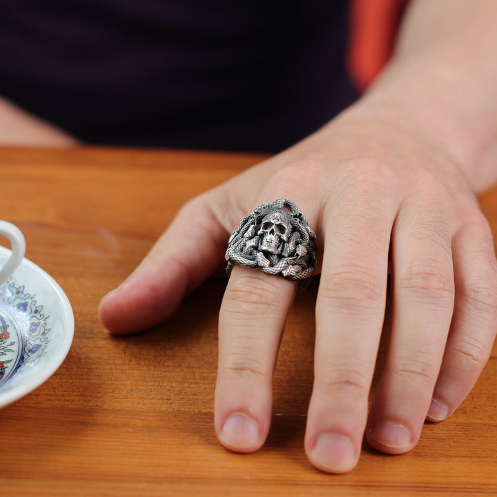 Sterling Silver Snake and Skull Ring for Men | Bold and Symbolic Gothic Ring for Men