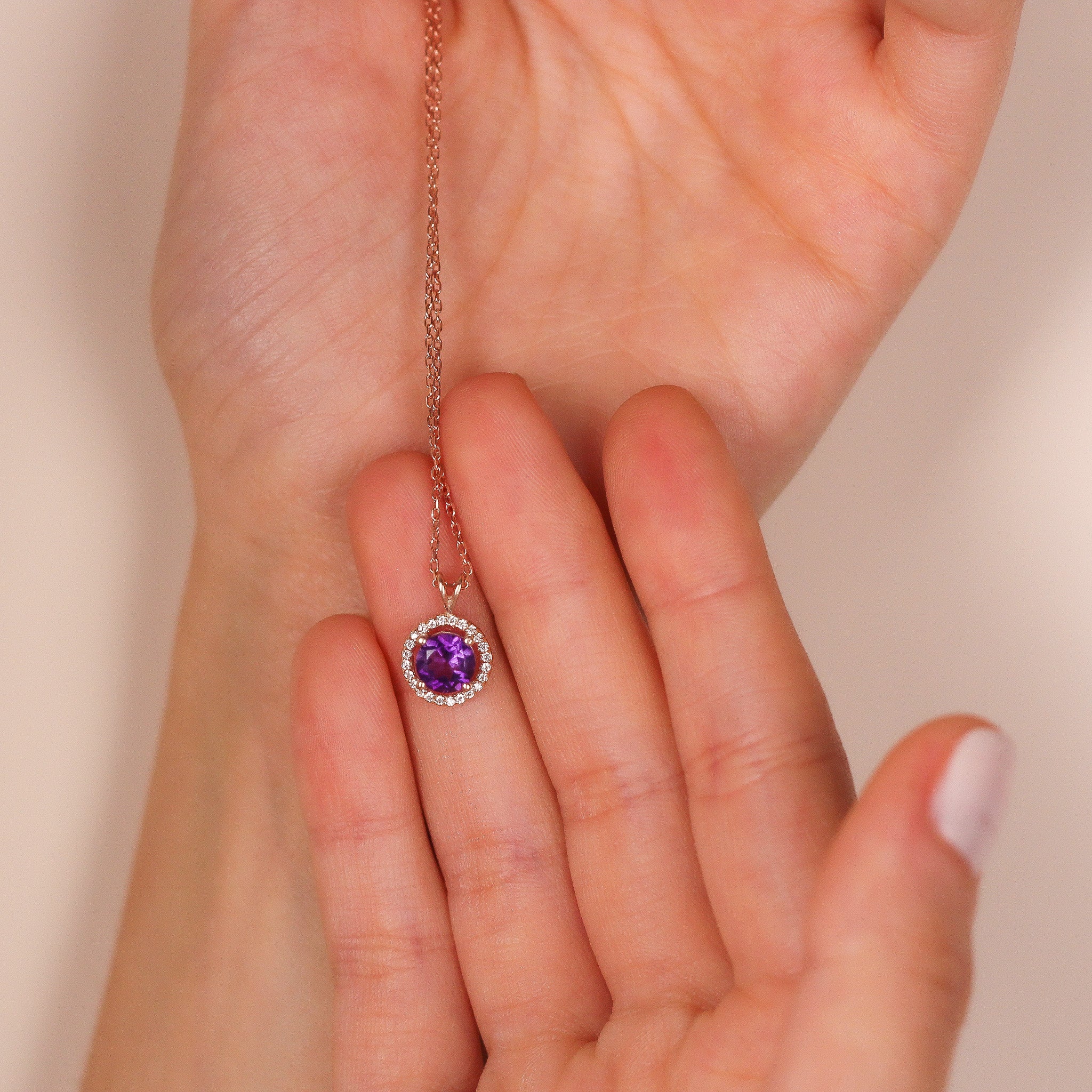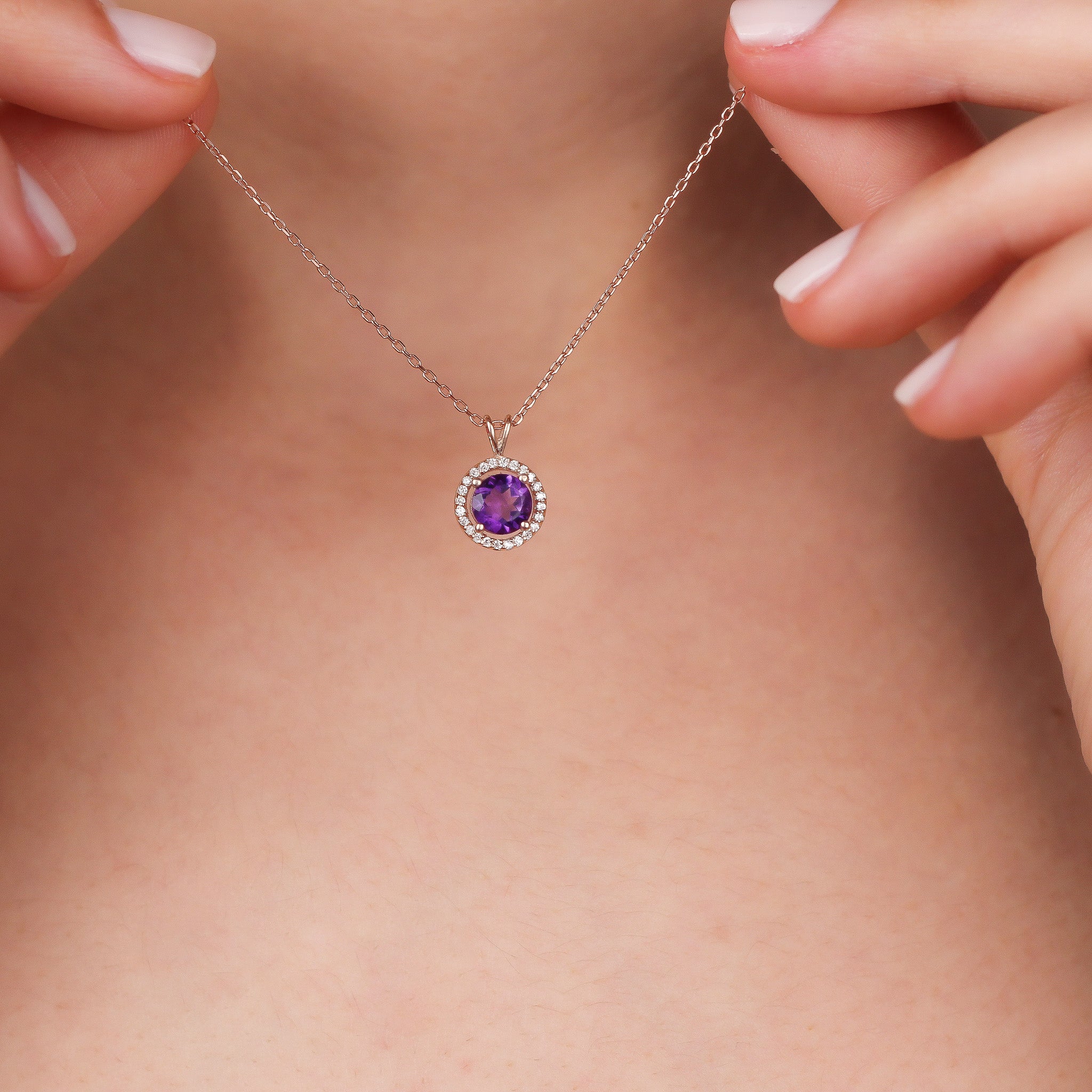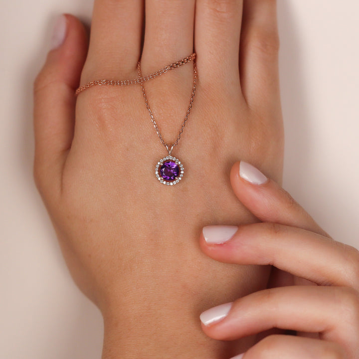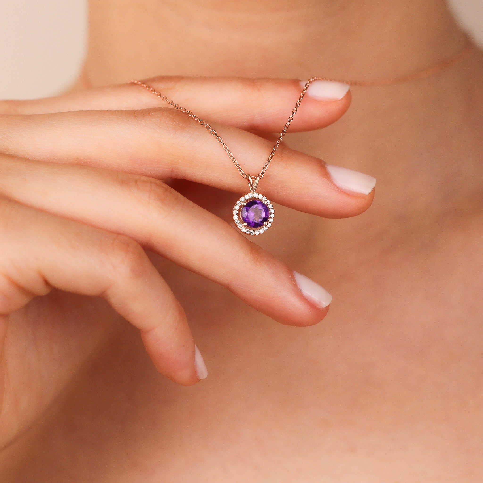 Elevate your elegance with this stunning Natural Amethyst Necklace, showcasing a vibrant oval amethyst gemstone encircled by a dazzling halo of diamonds or zircon stones. Crafted with precision in 925K sterling silver, 8K solid gold, or 14K solid gold, this luxurious pendant exudes sophistication and charm. Perfect for anniversaries, special moments, or as a statement piece, this necklace is designed for those who appreciate timeless elegance.