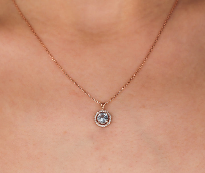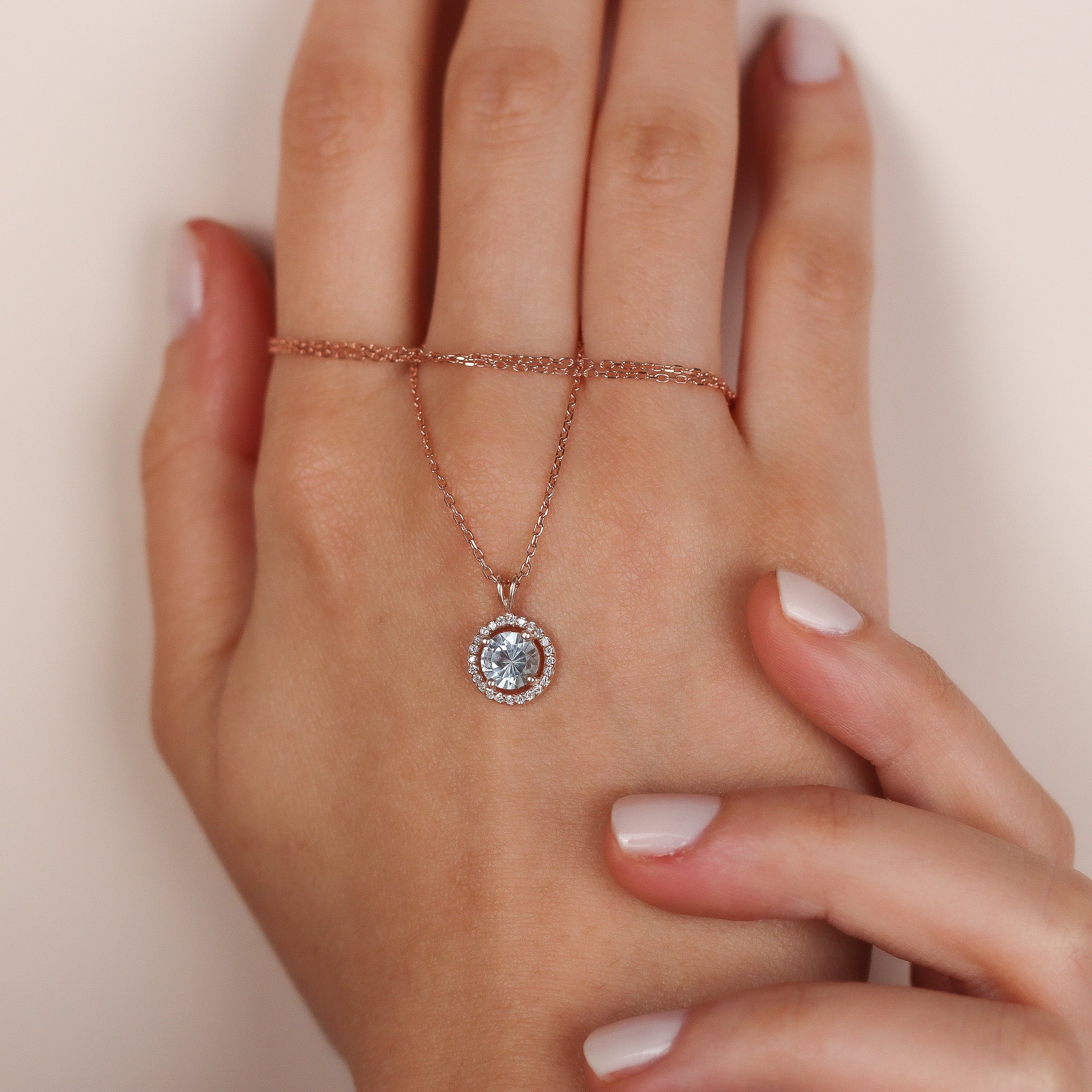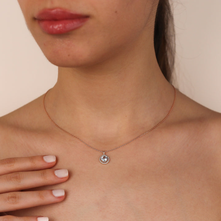 Capture the serene beauty of the sky with this Natural Sky Topaz Necklace, featuring a brilliant round sky blue topaz gemstone encircled by your choice of dazzling diamonds or shimmering cubic zirconia stones. Available in 925K sterling silver, 8K solid gold, or 14K solid gold, this pendant is a luxurious piece perfect for anniversaries, romantic gestures, or as a timeless addition to your jewelry collection.