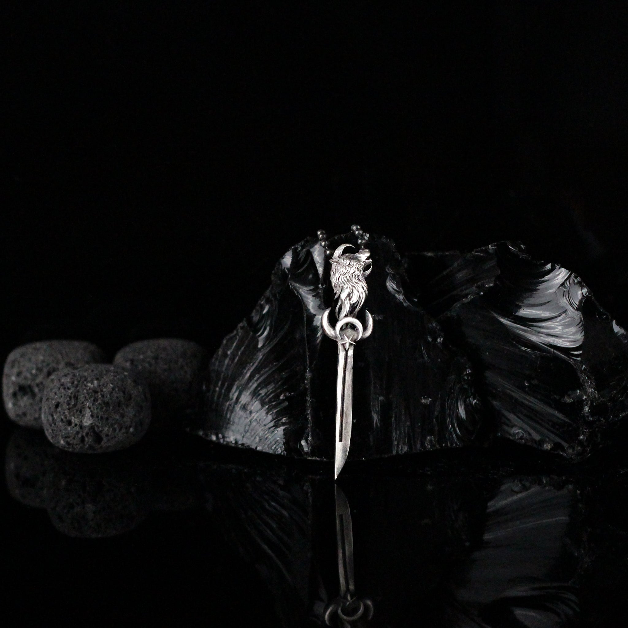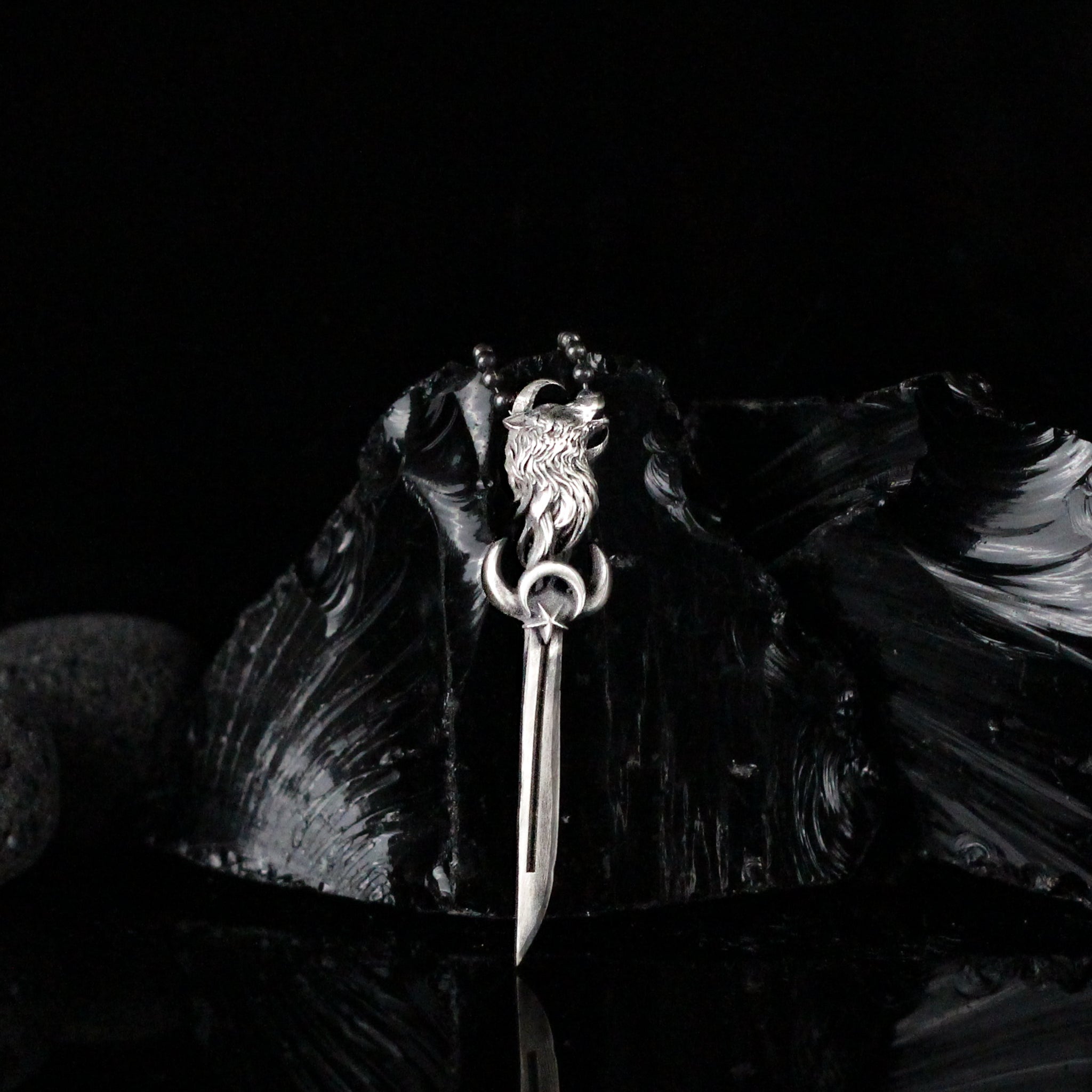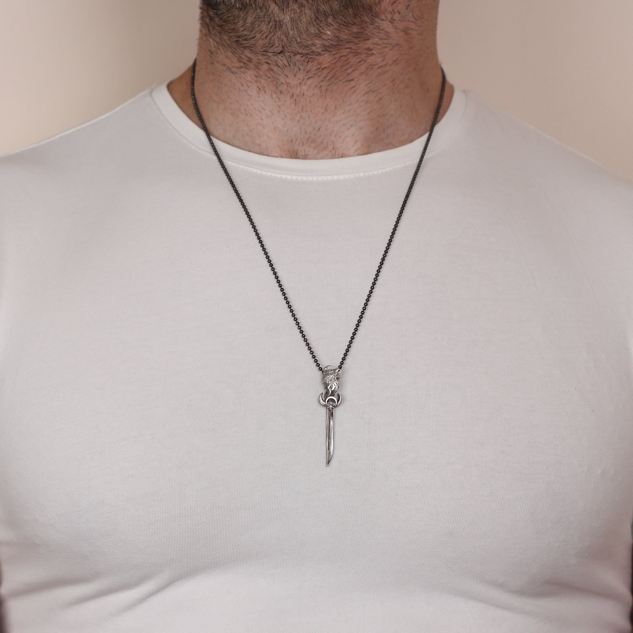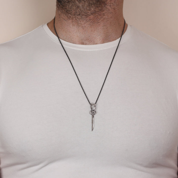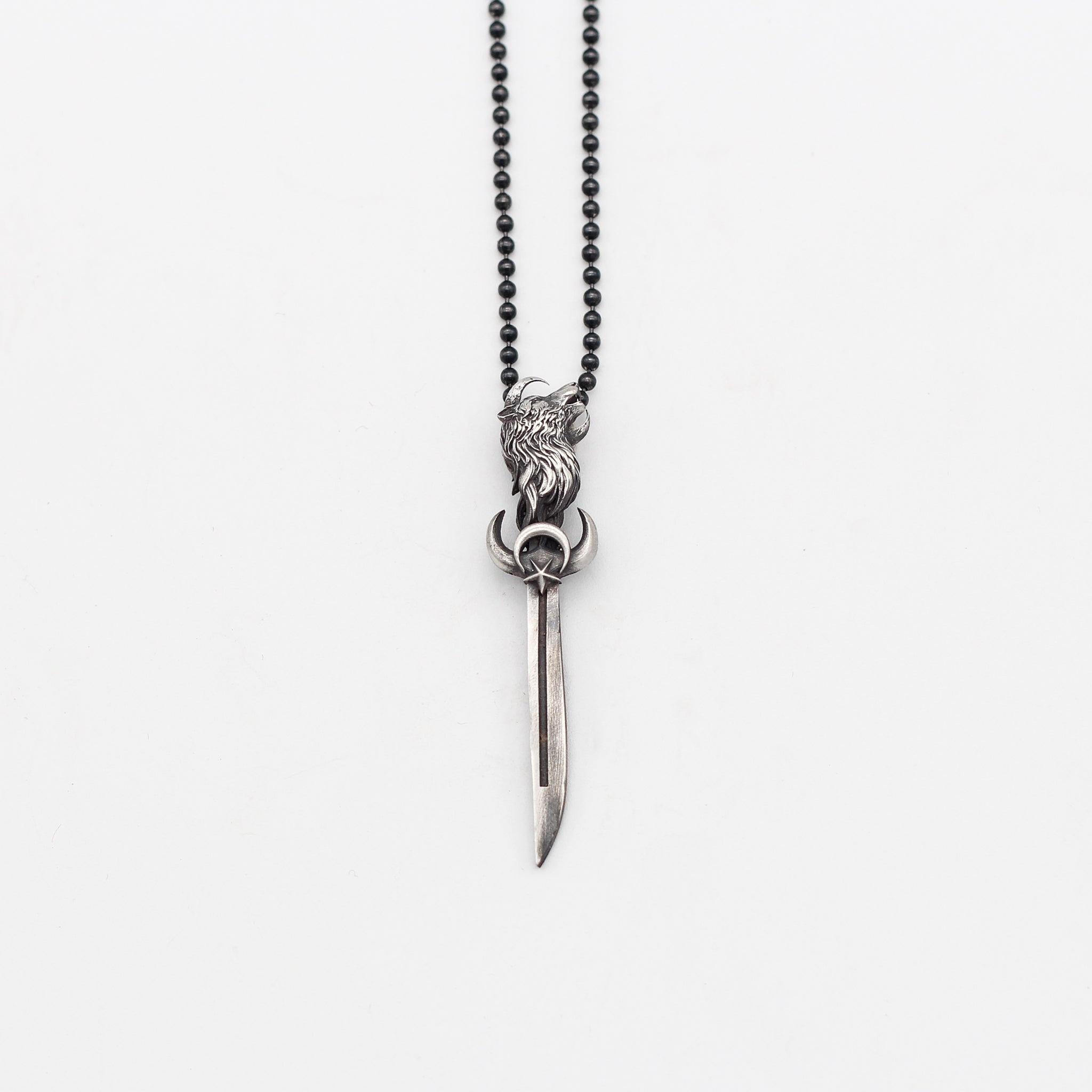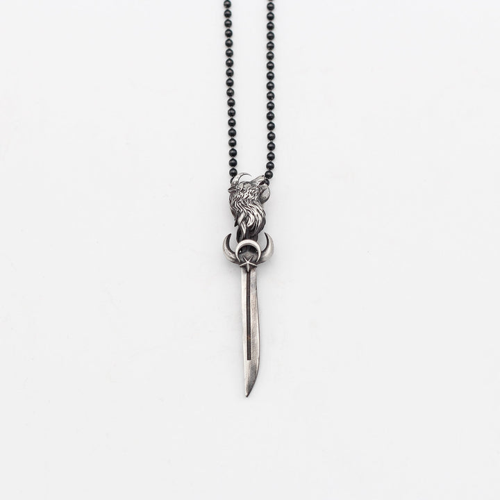 Silver Sword With The Star And Crescent Necklace, Sword With Wolf Pendant For Men