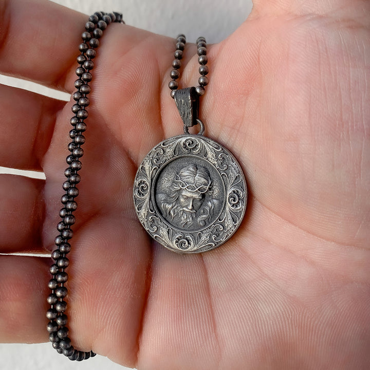 Celebrate your faith with this beautifully designed Crown of Thorns Jesus Necklace, made from premium 925 Sterling Silver. This intricately detailed pendant showcases Jesus with the Crown of Thorns, surrounded by ornate floral engravings, symbolizing sacrifice and divine love. A meaningful piece of religious jewelry for daily wear or special occasions.