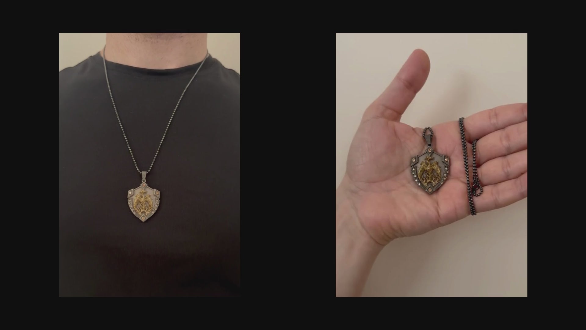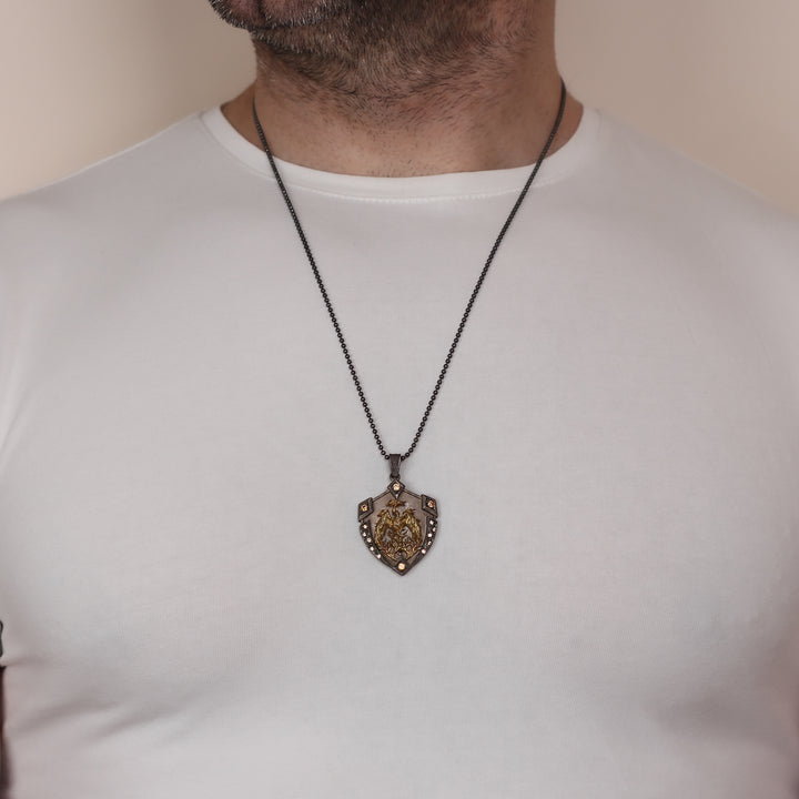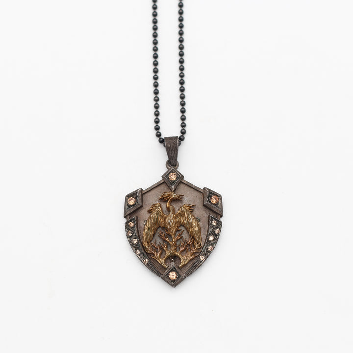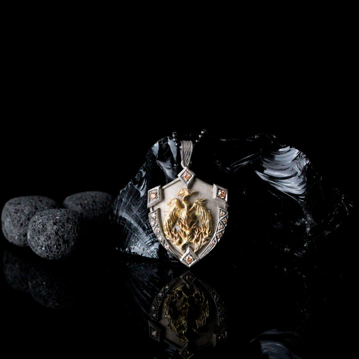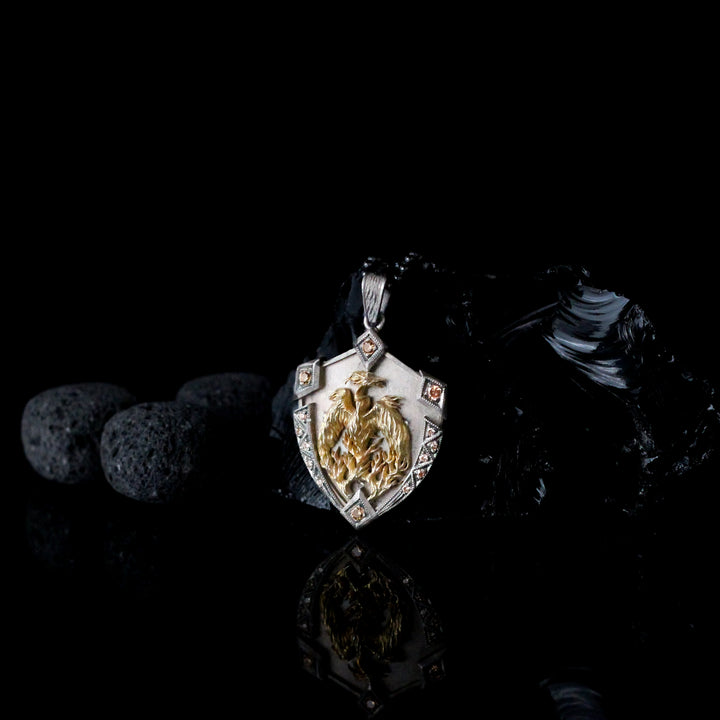 Sterling Silver Phoenix Shield Necklace with Gold Plating and Gem Accents | Unique Mens Necklace