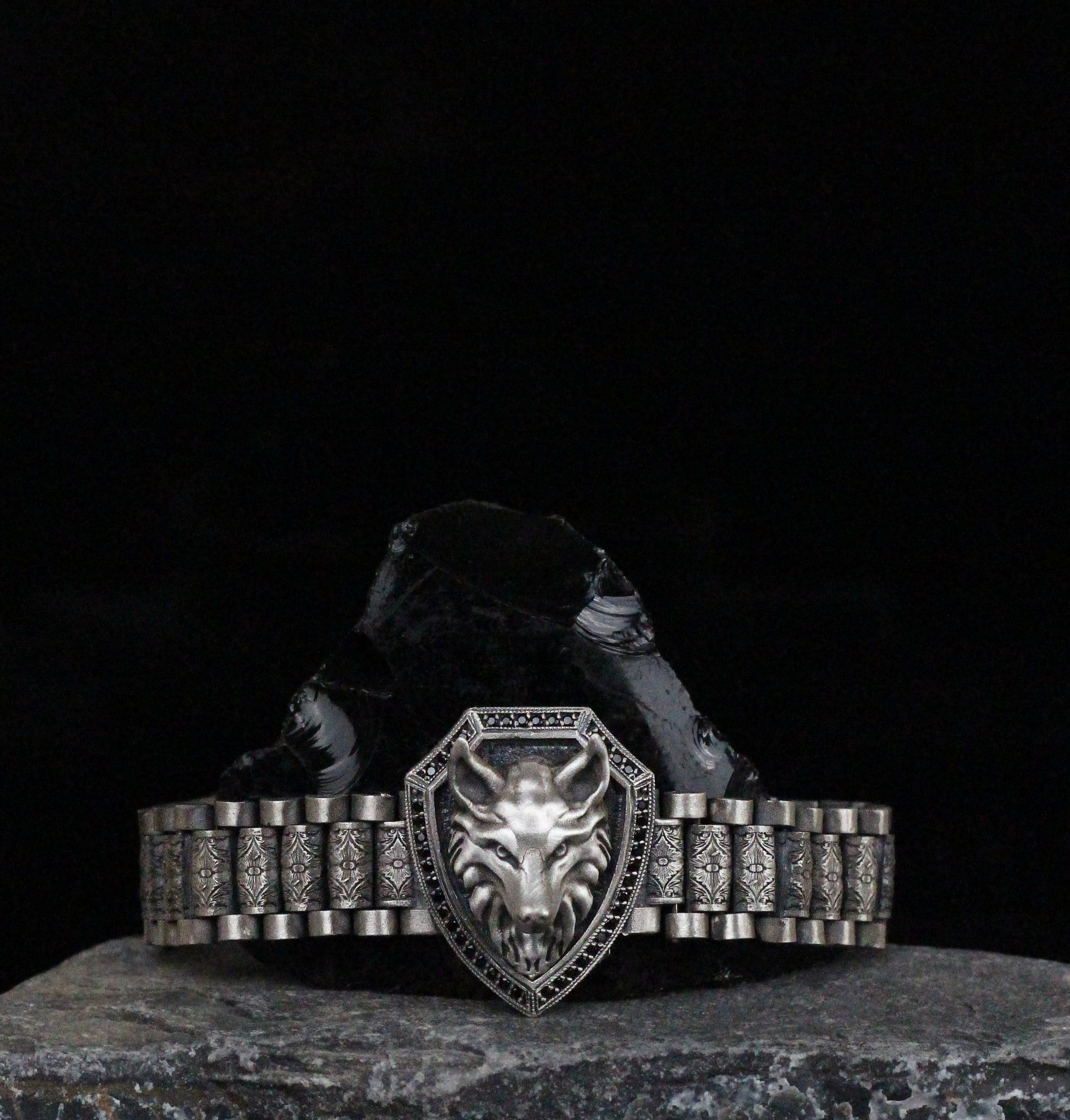 Elevate your style with this intricately crafted Wolf Shield Bracelet, made from 925K sterling silver. Inspired by Viking and medieval aesthetics, this bracelet features a fierce wolf emblem on a shield, symbolizing strength and protection. Perfect for men seeking a bold and unique accessory, it combines timeless Nordic design with durable craftsmanship. Whether as a gift or a personal statement piece, this bracelet is an extraordinary addition to any collection.