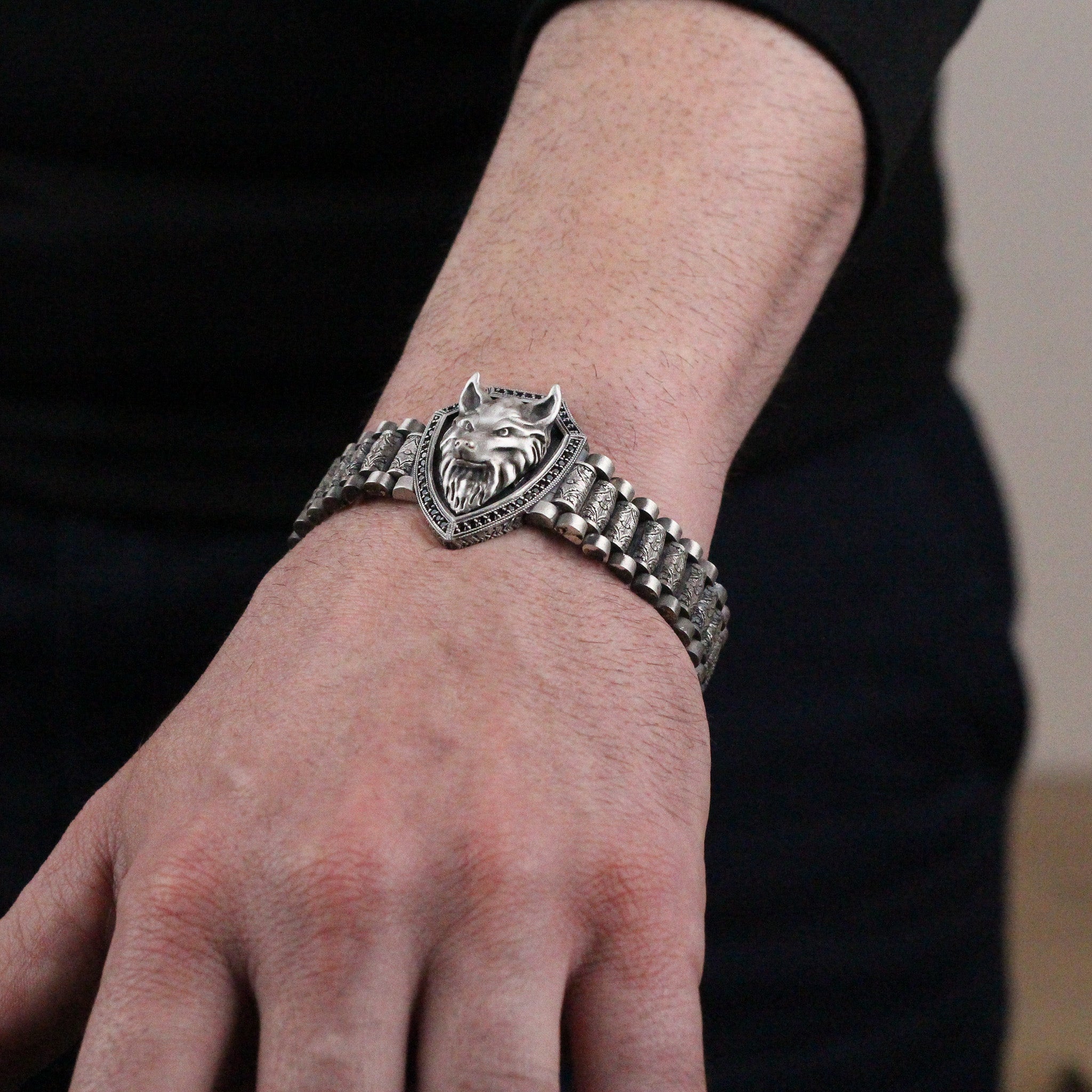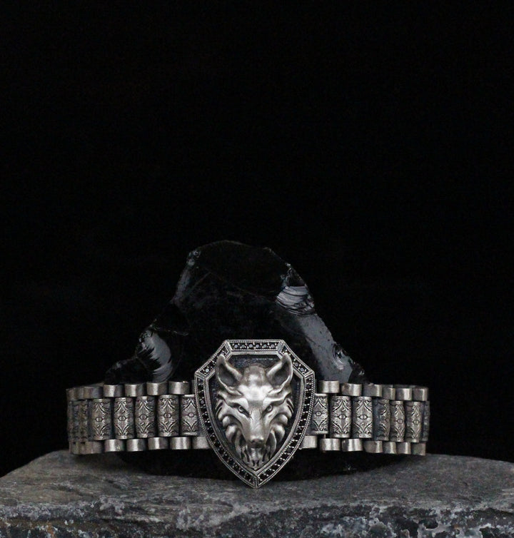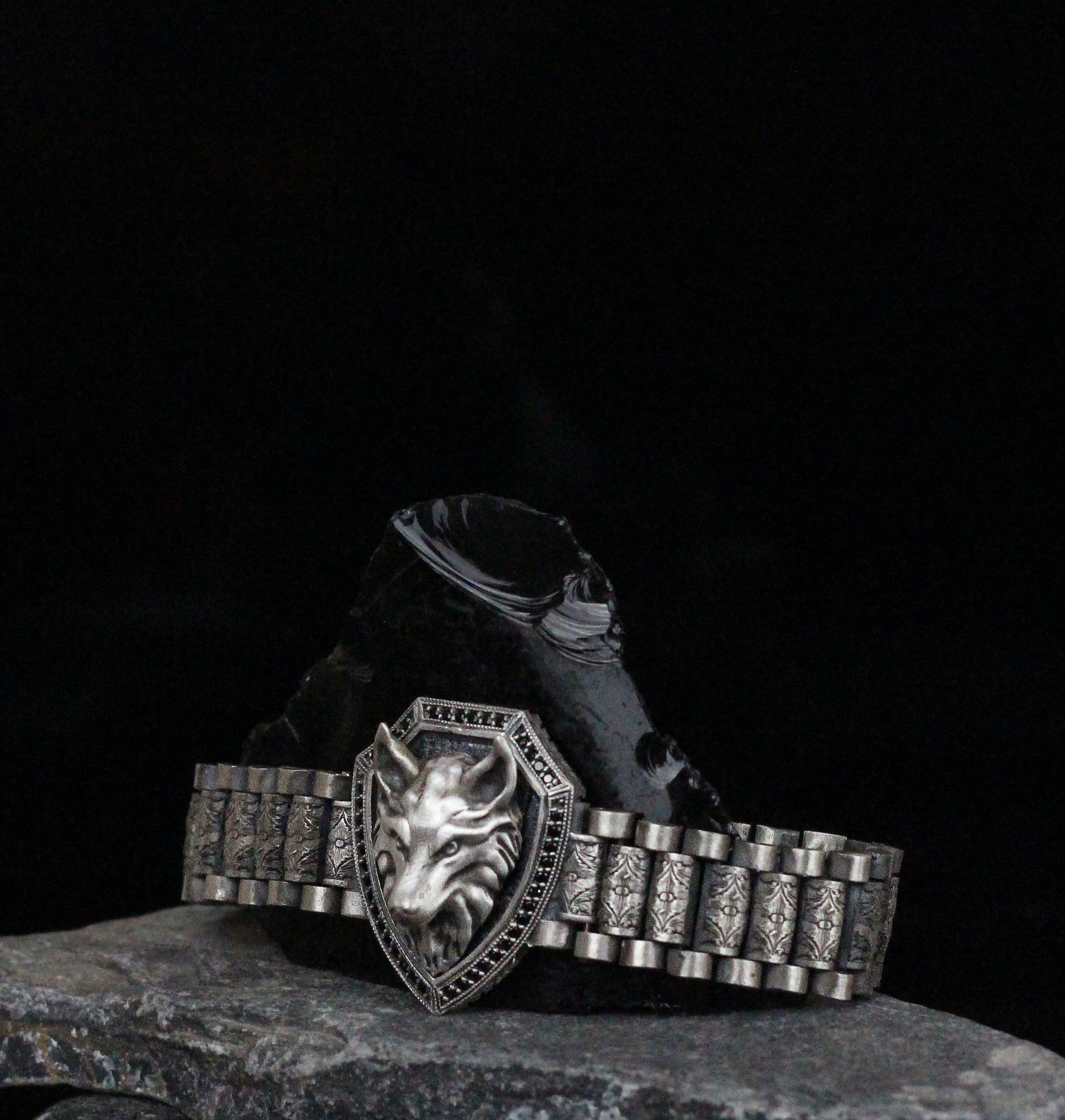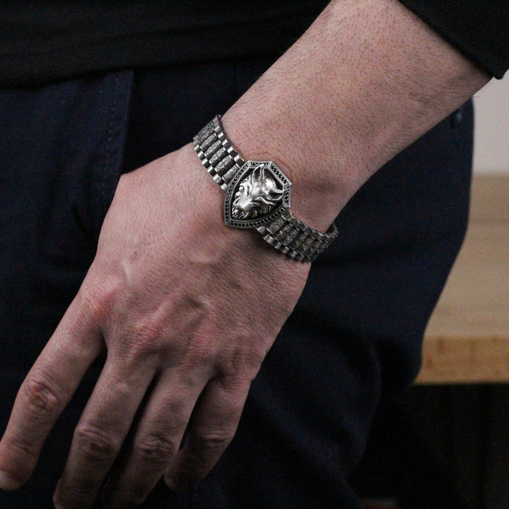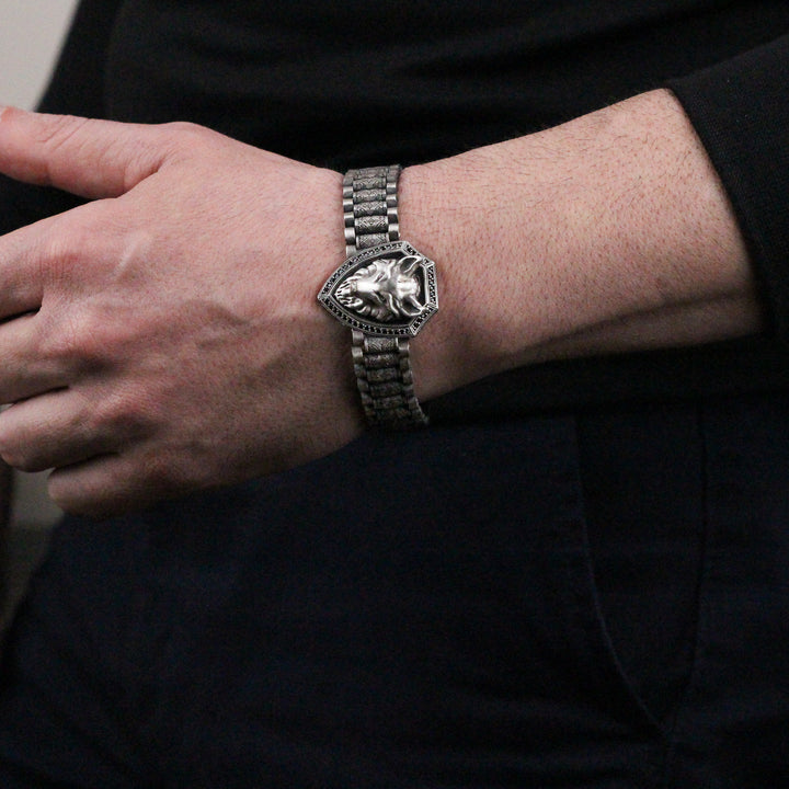 Bold Shield Bracelet with Wolf Emblem | Sterling Silver Medieval-Inspired Wolf Bracelet